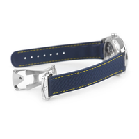 Crafted from stainless steel, the symmetrical 41 mm case is presented on a blue structured rubber strap with yellow stitching.