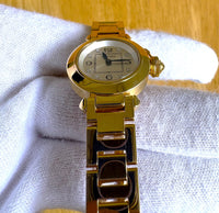 The “Miss Pasha,” the smallest model in the Pasha collection at 27 mm, features a vibrant yellow gold finish. This watch is perfect for those who found previous Pasha models too sporty.