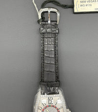 Dial: Silver or similar tone with roulette wheel feature visible in the centre, bold Arabic numerals, playful and skillfully designed for the Vegas theme.