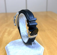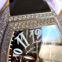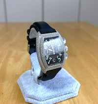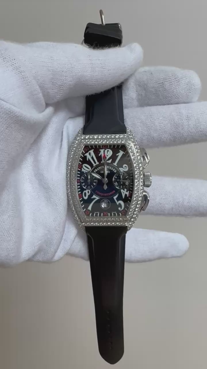 We are pleased to offer this stunning Franck Muller Conquistador Chronograph, reference 8001 CC D, a bold and luxurious timepiece featuring a solid white gold case and a brilliant diamond-set bezel. Designed for those who appreciate both elegance and sportiness, this model combines Franck Muller’s signature tonneau-shaped case with chronograph functionality and a modern rubber strap for daily wear.