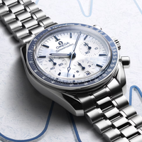 The 38 mm watch is crafted in stainless steel with a blue ceramic bezel that features a white enamel tachymeter scale. To create a wintry look, the varnished white dial includes a frosted blue transfer and finger trace pattern inspired by the Milano Cortina 2026 emblem. The white subdials are also varnished, with a special azurage finish that resembles a groomed ski slope.