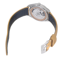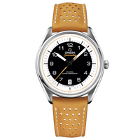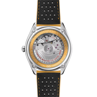 This 39.5 mm model has a stainless steel case and a yellow, micro-perforated leather strap. The domed black and white dial includes sporty hands, a date window and an easy-to-read minute track, as well as a yellow pulse reader that enables the wearer to calculate their pulse beats-per-minute.