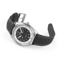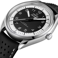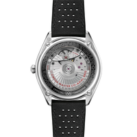 This 39.5 mm model has a stainless steel case and a black, micro-perforated leather strap. The domed black and white dial includes sporty hands, a date window and an easy-to-read minute track, as well as a black pulse reader that enables the wearer to calculate their pulse beats-per-minute.