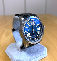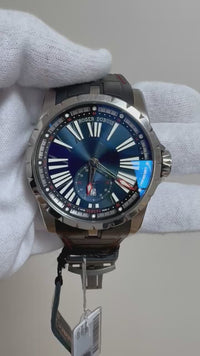 This timepiece features a titanium case—a rarity for Roger Dubuis—offering a lightweight and comfortable fit. The sunray-finished blue dial is accented with red, enhancing its sporty appeal. The see-through case back reveals the beautifully finished in-house movement, the RD830.