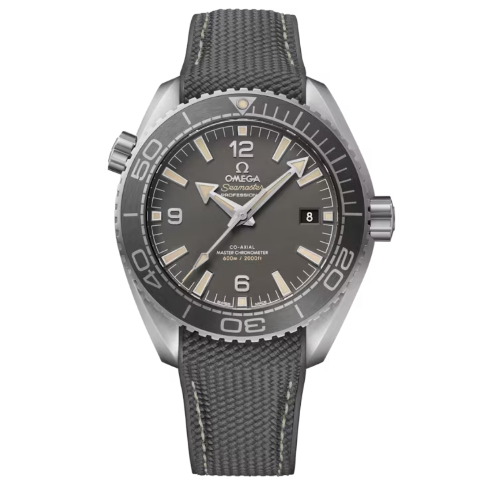 The dial is presented with a sand-blasted “gunmetal” grey galvanic treatment and includes a date window at 3 o’clock, along with transferred words in beige and white. The OMEGA logo, Arabic numerals, hands, and hour markers are all in PVD stainless steel with a brushed finish, while the beige Super-LumiNova improves visibility in dark conditions.